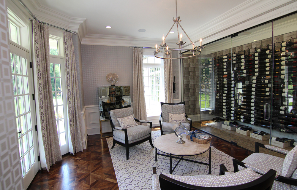 - Floor to ceiling glass walls showcase a fabulous wine collection. French doors and tall windows with transoms offer abundant natural light.