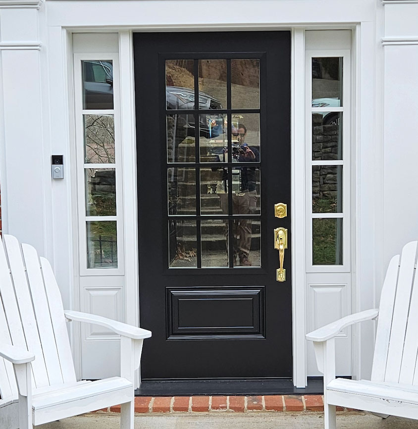Although these selections are a dramatic departure from the original, the door, sidelites, and trim work align seamlessly with the home’s architecture, creating a stylish, modern look.
